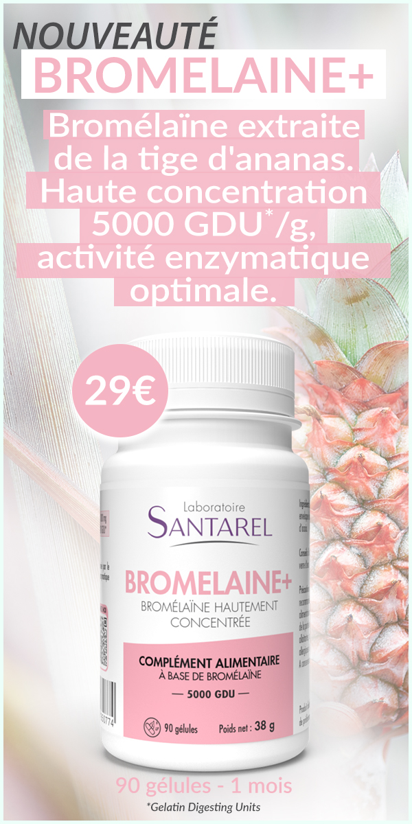 • Bromélaïne : Extraite de la tige d’ananas, la bromélaïne apporte de nombreux bienfaits. Ils favorisent notamment la réduction des gonflements, le bien-être de la peau et la cicatrisation.